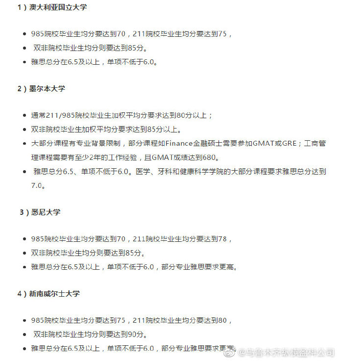 下面附部分英國及澳洲大學錄取要求,各位想申請名校的可以參考對照一下自己的條件(可能會根據(jù)學生個案調整)。