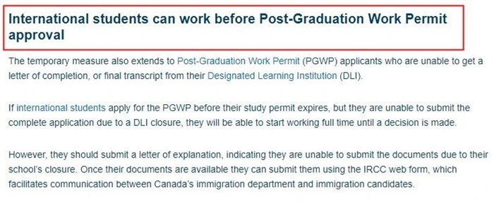 同時(shí),該項(xiàng)臨時(shí)措施還適用于無(wú)法獲得結(jié)業(yè)證明的畢業(yè)工簽(PGWP)申請(qǐng)人。根據(jù)加拿大移民部的政策,畢業(yè)工簽必須在學(xué)校開(kāi)具結(jié)業(yè)證明文件后的180天內(nèi)遞交申請(qǐng)。鑒于疫情期間,眾多指定學(xué)習(xí)機(jī)構(gòu)(DLI)停課可能導(dǎo)致留學(xué)生無(wú)法獲取最終成績(jī)單或畢業(yè)證書等材料,加拿大移民部允許留學(xué)生在申請(qǐng)獲批之前開(kāi)始全職工作。