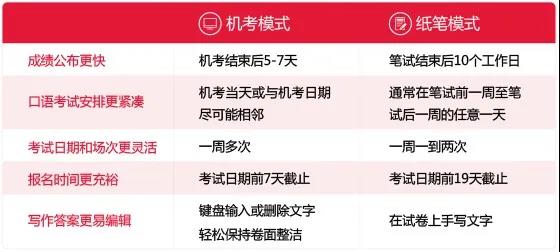 雅思機(jī)考有眾多優(yōu)勢(shì),在以下官方發(fā)布的機(jī)考模式與紙筆模式對(duì)比圖中,我們已經(jīng)能夠了解到機(jī)考模式的出分快、一天考完四科、一周多次等等優(yōu)勢(shì)。
