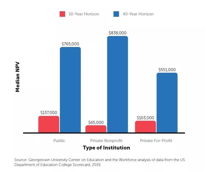 2. 長期私立學(xué)校的學(xué)費往往高得令人咂舌,但依然有許多學(xué)生即使背上學(xué)生貸款也要去讀私立學(xué)校,也許就是因為私立學(xué)校畢業(yè)生薪水更高。入學(xué)10年后,私立學(xué)校學(xué)生平均薪水要比公立學(xué)校高出8,000美元。長期來看,在還完高額的學(xué)生貸款后,私立學(xué)校的平均40年NPV