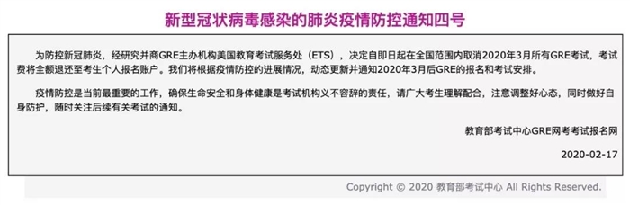 2月17日,ETS在官網(wǎng)上公布,GRE三月在中國(guó)大陸地區(qū)的所有考試取消。