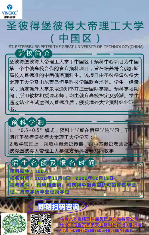 1. “0.5+0.5”模式,預科上學期在青島恒星科技學院學習(2020年12月-2021年7月),下學期在圣彼得堡彼得大帝理工大學學習;