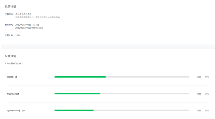 在之前我曾經(jīng)看到網(wǎng)上做過一個調(diào)查,九月你是不是要回英國上課。在參與的回答的100多名同學(xué)中,我們可以看到十分平均的數(shù)據(jù):