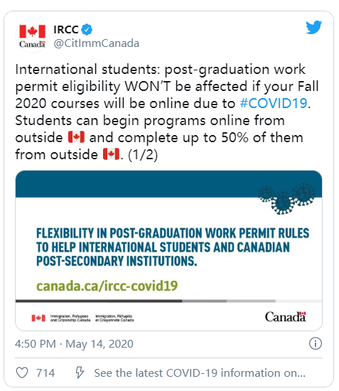 基于加拿大移民局原有的政策,一般網(wǎng)課是不計(jì)入PGWP的,但是由于疫情對(duì)留學(xué)生產(chǎn)生了重大的影響,外加受到健康和旅行的限制,很多留學(xué)生無(wú)法順利返校,因此,加拿大移民部允許留學(xué)生在2020年秋季學(xué)年留在海外完成50%的線上課程,并在之后返回加拿大完成整個(gè)課程后,仍有資格獲取得畢業(yè)工簽。
