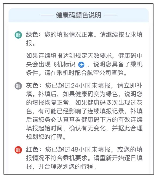 綠碼:表示你的填報(bào)情況正常,請繼續(xù)在規(guī)定時(shí)間內(nèi)填報(bào),不得登機(jī)。等到綠碼連續(xù)填報(bào)達(dá)到了規(guī)定的天數(shù)要求,健康碼中央會出現(xiàn)飛機(jī)標(biāo)識??,說明您具備了乘機(jī)條件。請?jiān)诔藱C(jī)時(shí)配合航空公司查驗(yàn)。