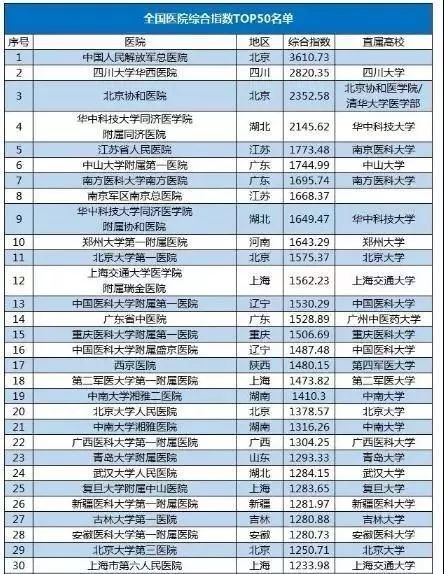 從上面的列表中可以看出,浙江大學(xué)有3所附屬醫(yī)院入選,是高校中入選數(shù)量最多的高校。另外,北京大學(xué),復(fù)旦大學(xué),上海交通大學(xué),武漢大學(xué),華中科技大學(xué),中南大學(xué),西安交通大學(xué)七所高校各有兩所附屬醫(yī)院入選。